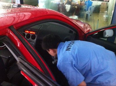 在全部工作開始前,工作人員用塑料薄膜將方向盤和儀表臺(tái)全部包好,防止因噴灑液體而損壞電器元件。